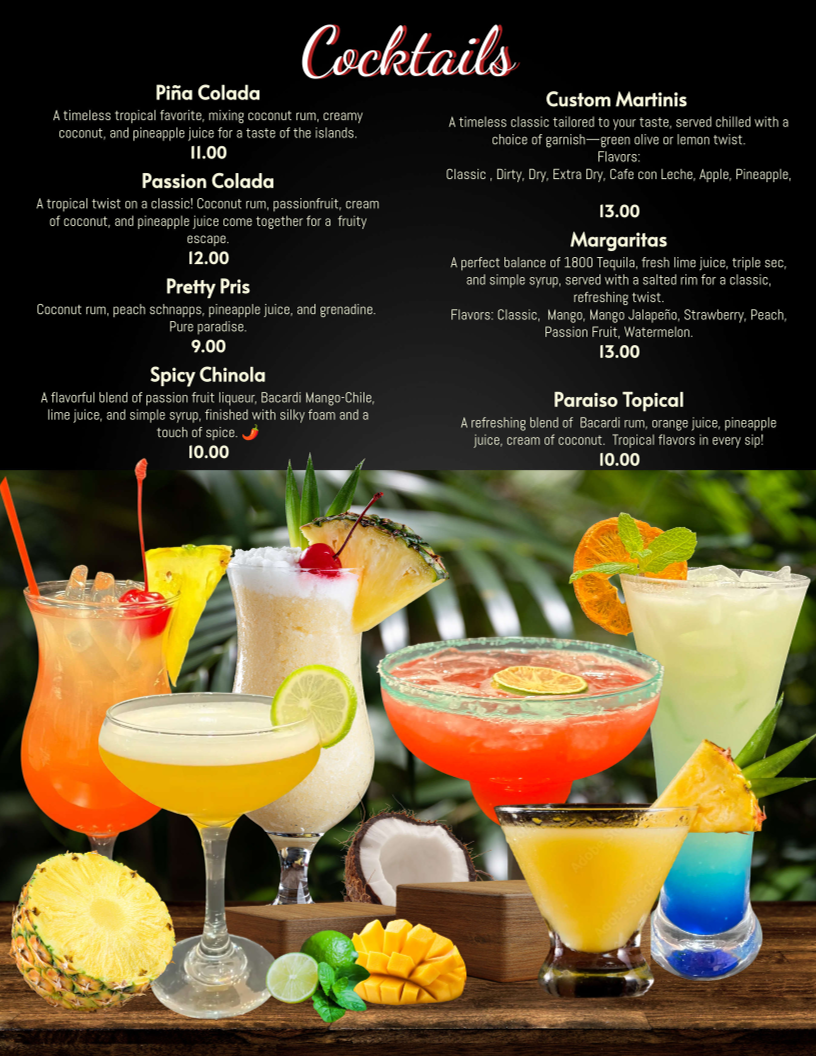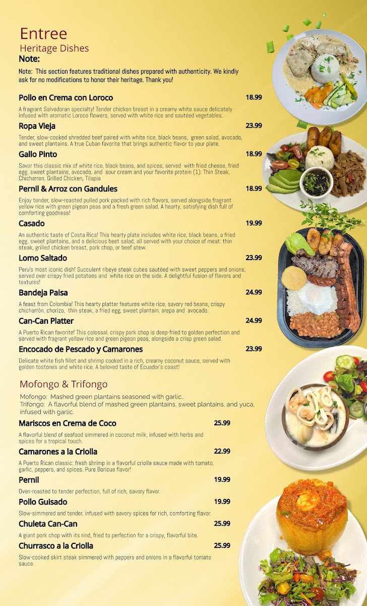 The menu highlights include a range of tacos, such as the Barbacoa Tacos and Chicken Tacos, masterfully prepared to welcome your taste buds. The entrees stand out with classics like Ropa Vieja and authentic Costa Rican Casado. For seafood lovers, the Mariscos En Crema De Coco is a must-try.